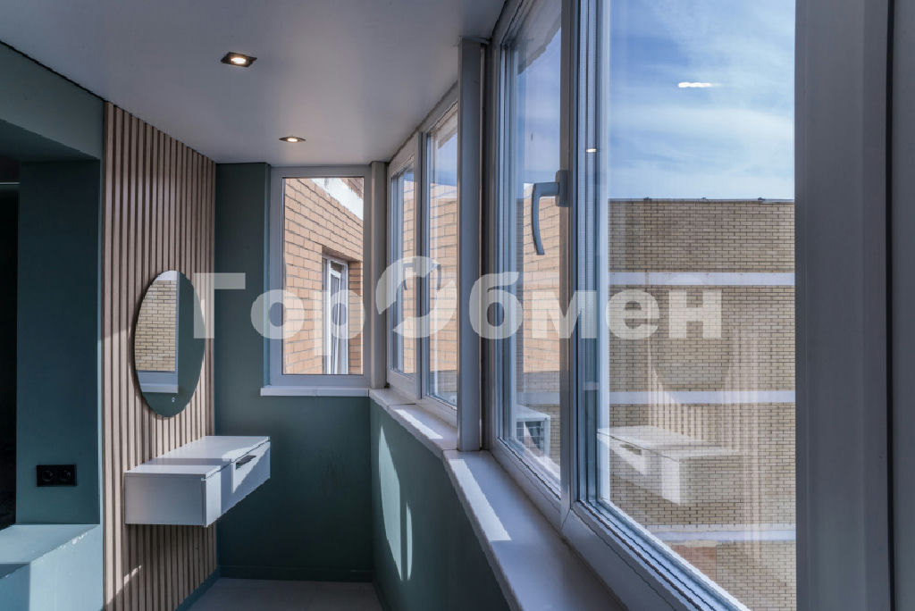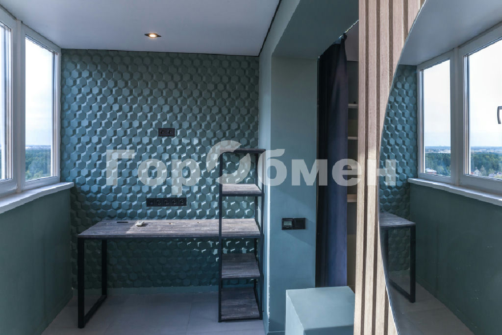 Утепленная лоджия с оборудованным рабочим местом. Просторный холл, две гардеробные комнаты.